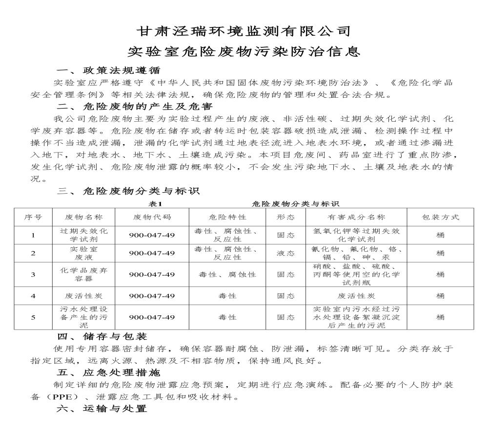 甘肅涇瑞環(huán)境監(jiān)測(cè)有限公司實(shí)驗(yàn)室危險(xiǎn)廢物污染防治信息