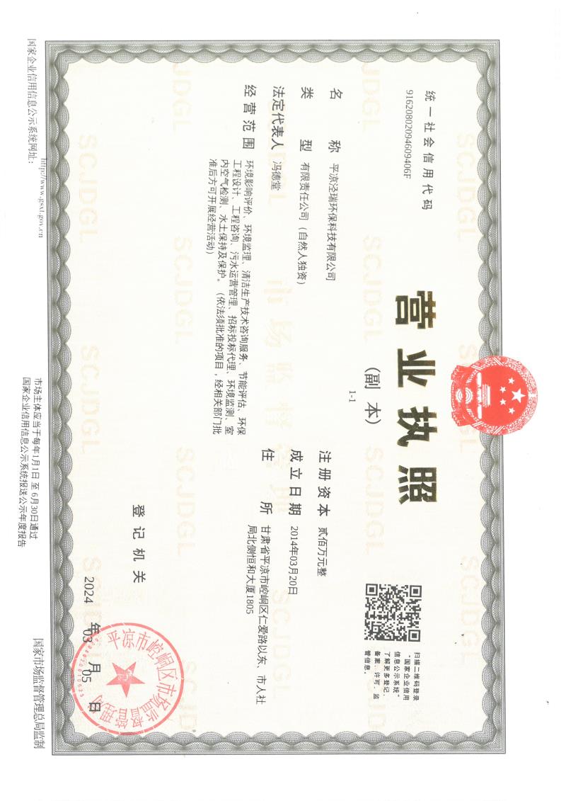 平?jīng)鰶苋瓠h(huán)??萍加邢薰緺I業(yè)執(zhí)照