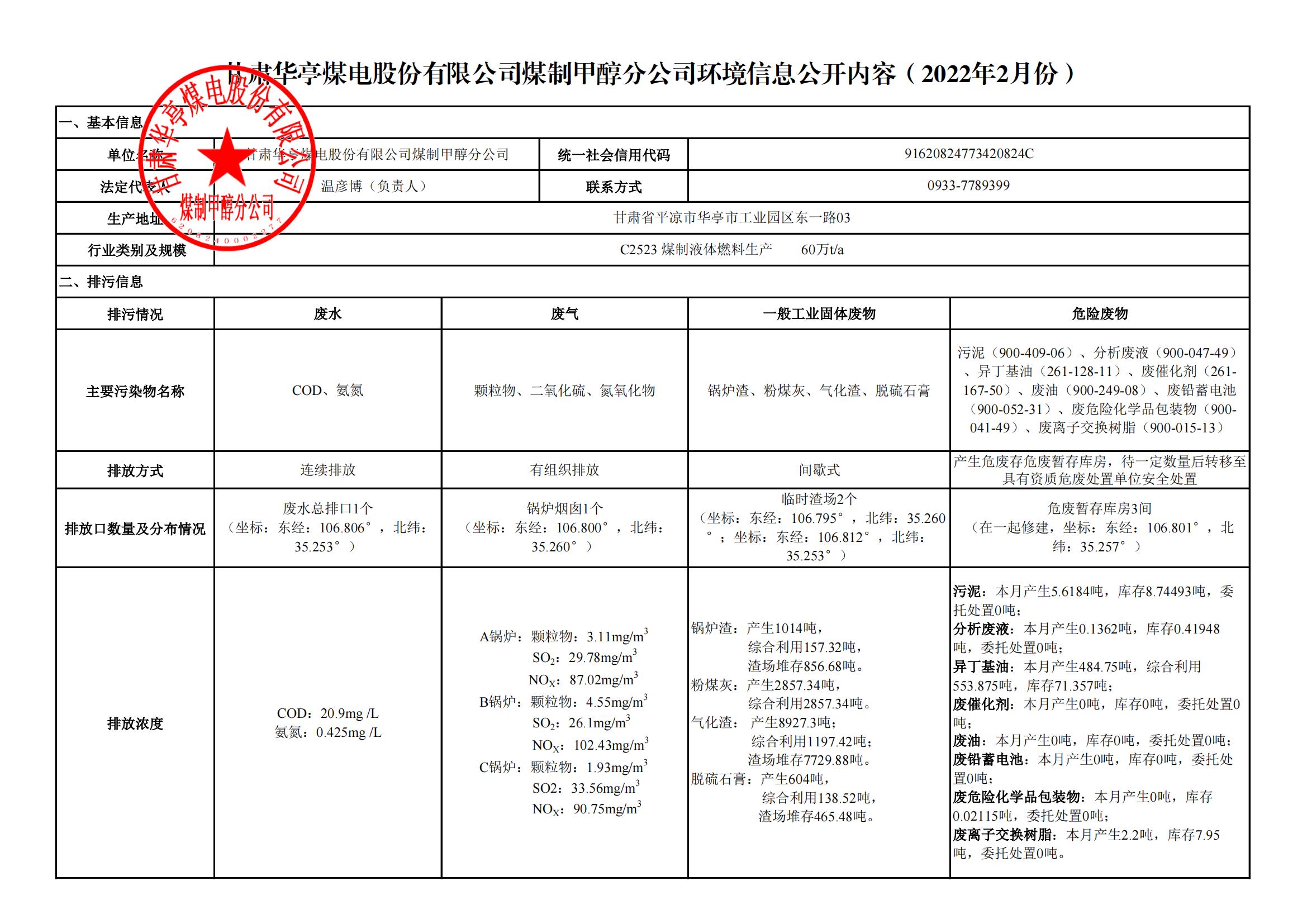 煤制甲醇分公司環(huán)境信息公開(kāi)內(nèi)容(2022年2月)
